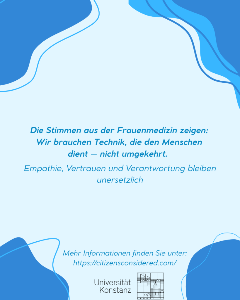 In Seminar „Citizens Consider(ed)“ an der Universität Konstanz verfolgten wir als Projektgruppe das Ziel, ein Thema zu erforschen, das künstliche Intelligenz (KI) und Nachhaltigkeit verbindet. Unsere Projektgruppe bestand aus drei jungen Frauen, die alle bereits negative Erfahrungen mit dem Gesundheitssystem gemacht hatten. Entsprechend haben wir uns gefragt: „Was muss sich in Zukunft verändern und wie können wir dazu beitragen?“.